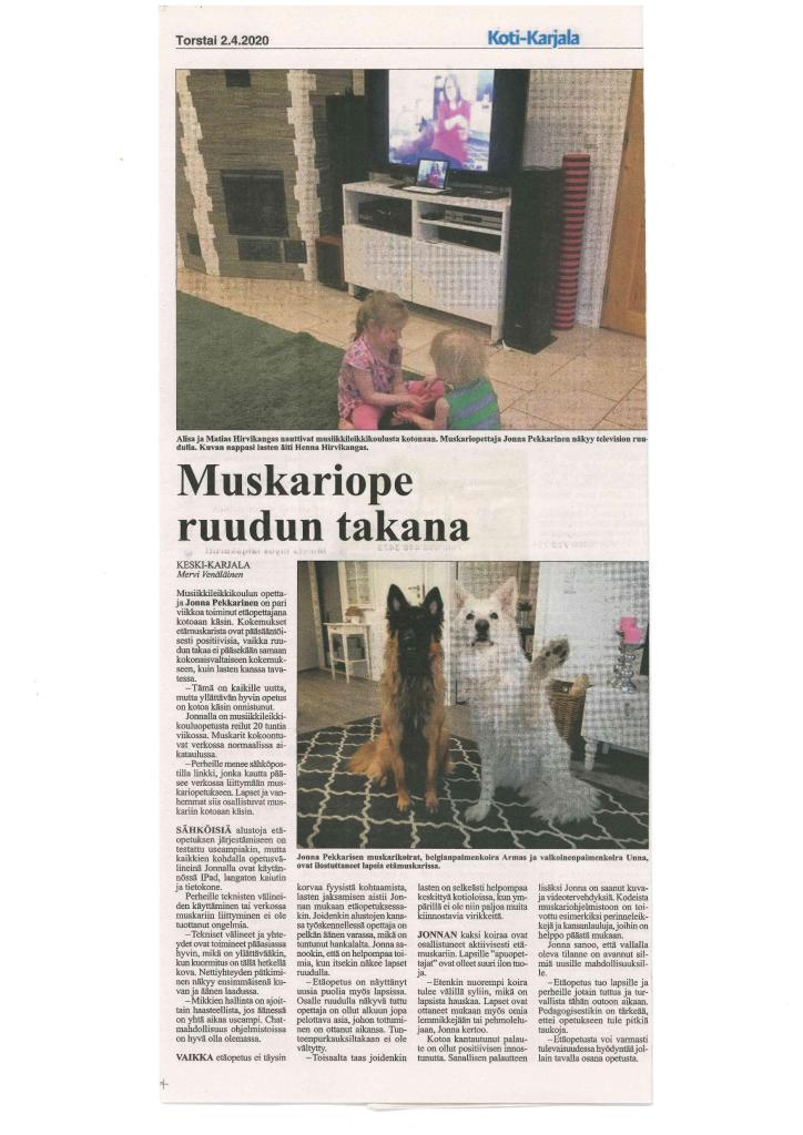 Viime kevään etäopetusjakson aikana Koti-Karjala kirjoitti ”Muskariopesta ruudun takana”. Muskariopettajamme Jonna Pekkarisen mukaan etäopetus lähti keväällä hyvin käyntiin ja näytti lapsissa myös uusia puolia. Vaikka tunteenpurkauksiakin koettiin, joidenkin lasten on Jonnan mukaan helpompi keskittyä kotona. Välillä apuna muskaritunneilla keväällä toimivat myös Jonnan koirat Armas ja Unna.